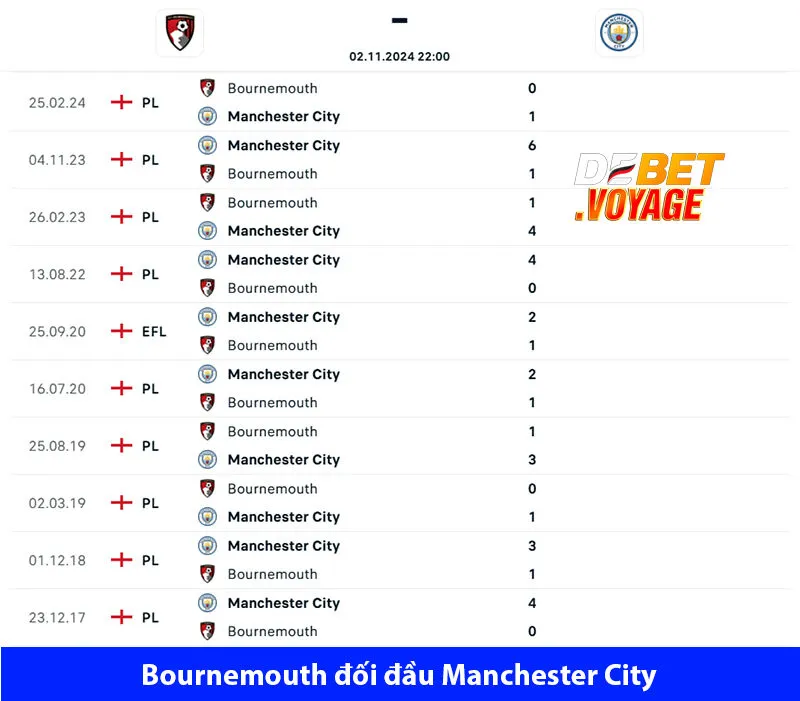 Manchester City đã không thua Bournemouth trong 16 lần gặp nhau gần nhất, giành chiến thắng liên tiếp trong 14 lần gần nhất. Sự thống trị này có thể đóng vai trò quan trọng trong lợi thế tâm lý trong suốt trận đấu. Bournemouth sẽ cần khai thác hiệu quả lợi thế sân nhà để thách thức thành tích ấn tượng của City.